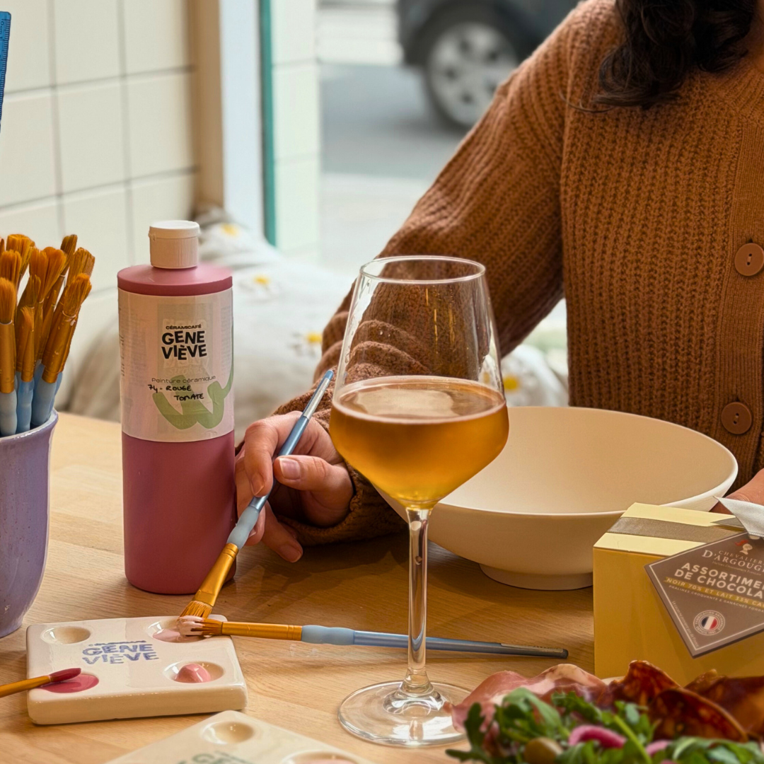 • Un atelier créatif de 3h pour peindre la céramique qui fera vibrer votre âme d’artiste (pièce S par personne ou pièce L à deux pour les duos motivés).